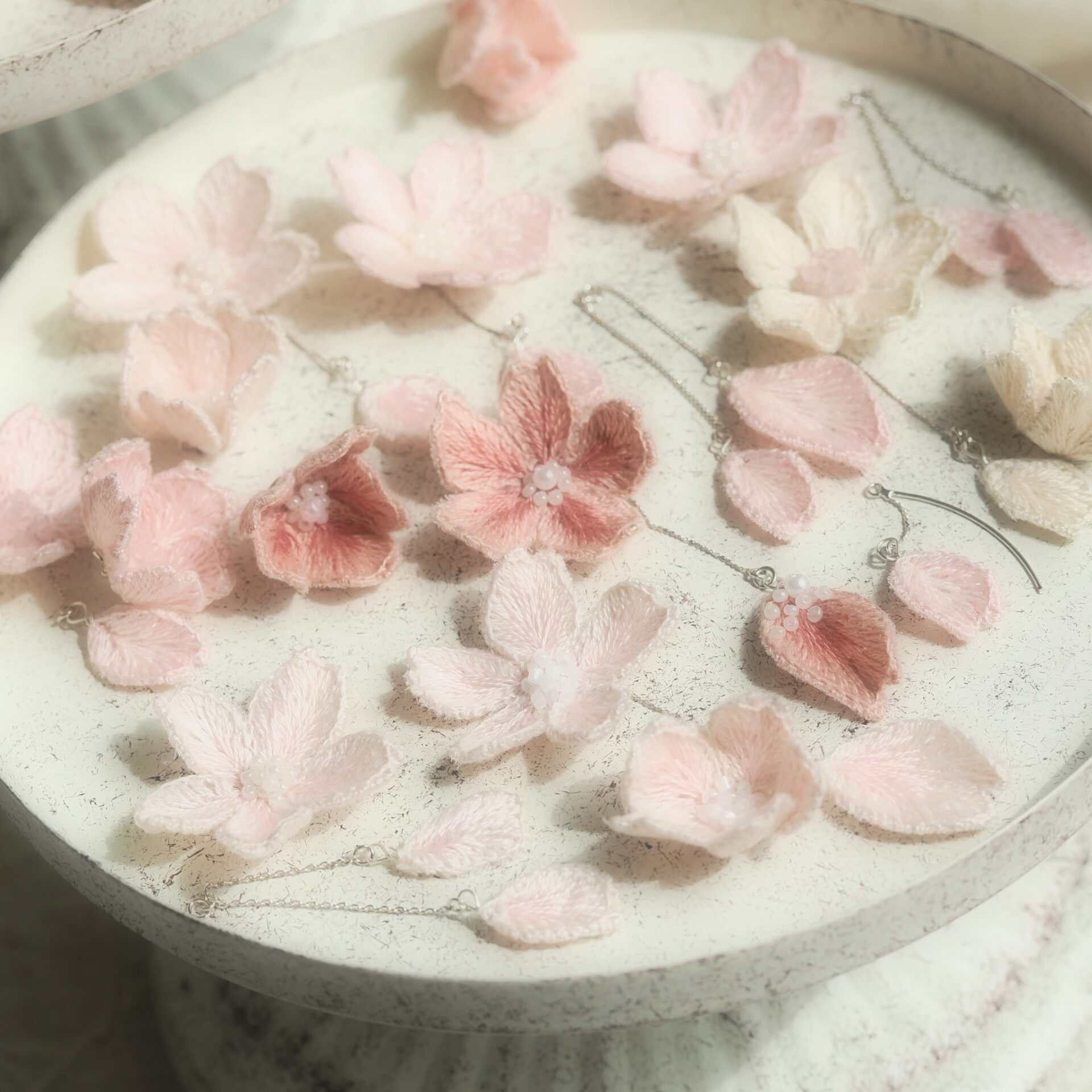 やわらかな桜色の刺繍糸を重ねながら、